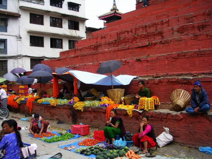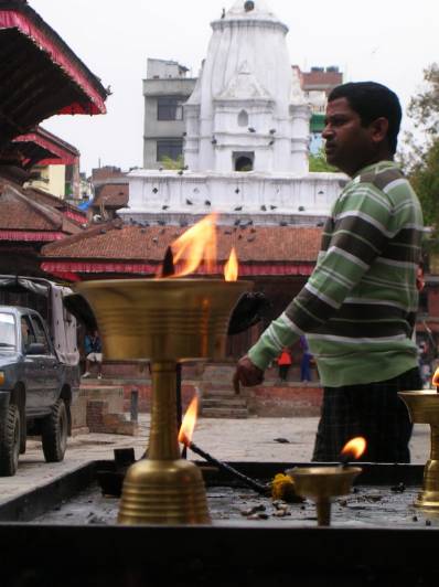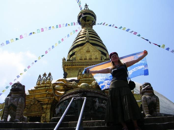 | Наша группа первоначально состояла из 8 чел(почему первоначально,расскажу позже).Я,Юля,Наташа-Барнаул,Костя-Новосиб,Игорь-гид-Омск,Куантай-Астана,Саша,Оля-Москва.1 мая-день рождения Куантая(он же 1-й день пребывания в Катманду),прекрасный повод познакомится поближе.Часть группы отправилась в ресторан.Официанты ни шолох по английски,впрочем и мы не особенно.Пришлось действовать отработанным мной методом,в прошлой поездке,а именно,брать за рукав оф. и тащить(упирался,блин) его на кухню.Там пальцем тыкаю в продукты,которые хотелось бы видеть на столе в готовом виде,повар в ступоре,оф -тоже.Не каждый день туда наведываются барышни ростом под 2 метра,да еще и белые.Но, шок это по нашему.Приготовили тем не менее.но это была только первая часть марлезонского балета...Когда оф,указав на одно из блюд,жестами показал,что оно острое,Костян решил добить его,взяв кусок из тарелки и закусив все это маринованным перцем чили,приговаривая :"Ну, и где тут острое,принеси еще перца".Надо было видеть лицо оф.....Мир перевернулся у него в голове,он несколько минут не мог отойти от стола.Мы -в повалку от смеха,Костян держится....делает вид...."Не забывай,Костя,что засунул с верху,то выйдет и снизу ..."предупреждала его я.Как только оф. ушел,костя начал спускать пары,выпив все пиво.Ну а на следующее утро был рассказ об огнедышащей жопе... Знакомство с Катманду началось на следующий день с Дворцовой площади,посещения дворца воплощенной в 6-и летней девочки,богини Кумари.Немного об этом расскажу.Выбирают девочку из знатной касты по специальным признакам,считается большой честью,бить избранной.Девочку забирают из семьи во дворец,из которого она не выходит,к ней приводят детей,с которыми она общается.Раз в день она подходит к окну(см. фото),где ее приветствуют собравшиеся люди.Действие происходит в течении 2-х,3-х мин,она смотрит на нас мы в молчании на нее,потом она уходит.Фото и видео категорически запрещены.Живет во дворце она до первой крови,т.е. лет до 13.Дальнейшая судьба девочки не веселая,замуж она не выходит,потому что считается что муж умрет,доживает где-нибудь в монастыре в одиночестве.Хотя.это наш взгляд на вещи,наверняка,для них это видится с другой стороны.
