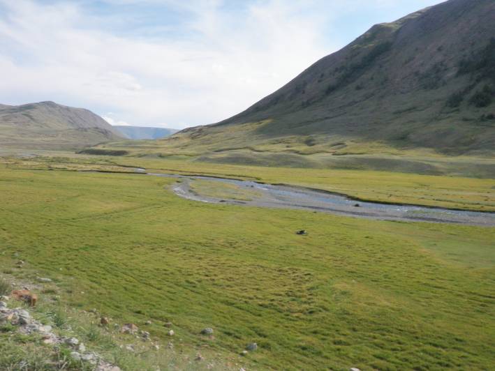 Долина Тархаты не менее живописна чем сам Укок. Там мы остановились на ночевку съехав с дороги и повернув за холм. Мимо проходили стада коров, парень прогнал табун лошадей, девушка проехала на пятнистом мустанге. Вполне спокойно и мирно.
