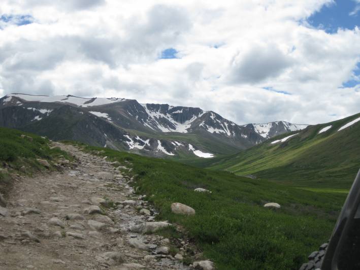 19,07 утром уже кидались снежками на перевале Теплыи ключ, подьем занял один час, спуск в долину Укока 2 часа. Льда на перевале небыло, дорога сухая, не считая ручейков, камней на дороге как до того места откуда растут ноги.